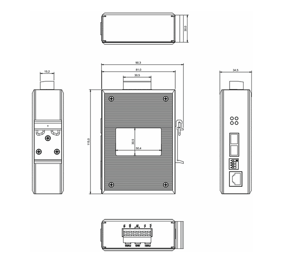Housing: IP40 Protection; Aluminum Alloy Installation: DIN-rail mounting, wall mounting(with optional kit) Dimension: 115*81*35mm(device); 220*175*73mm(packing) Weight: 0.30kg(device); 0.43kg(device with packing) |